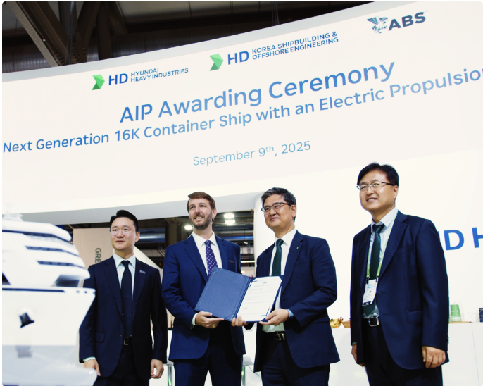 At Gastech 2025, ABS granted Approval in Principle (AiP) to HD Korea Shipbuilding & Offshore Engineering (HD KSOE) and HD Hyundai Heavy Industries (HD HHI) for their 16,000 TEU container ship design with electric propulsion.