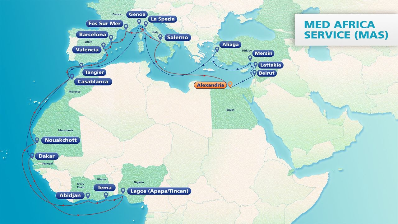The updated rotation connects major ports across both regions: Alexandria, Beirut, Lattakia, Mersin, Aliaga, La Spezia, Genoa, Casablanca, Dakar, Lagos (Apapa & Tincan), Tema, Abidjan, Nouakchott, Tangier, Valencia, Barcelona, Marseilles, La Spezia, Genoa, Salerno, and returns to Alexandria.