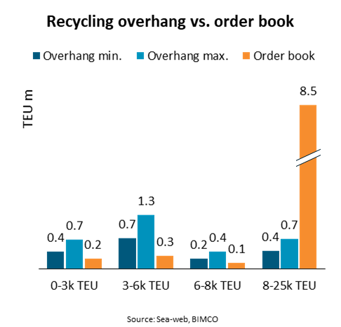 However, with a large order book, potential demand shifts if Suez Canal routes normalize, and stricter efficiency regulations, actual recycling could exceed these estimates. Under weaker 2010s market conditions, BIMCO calculates a maximum overhang of 850 ships (3.1m TEU).