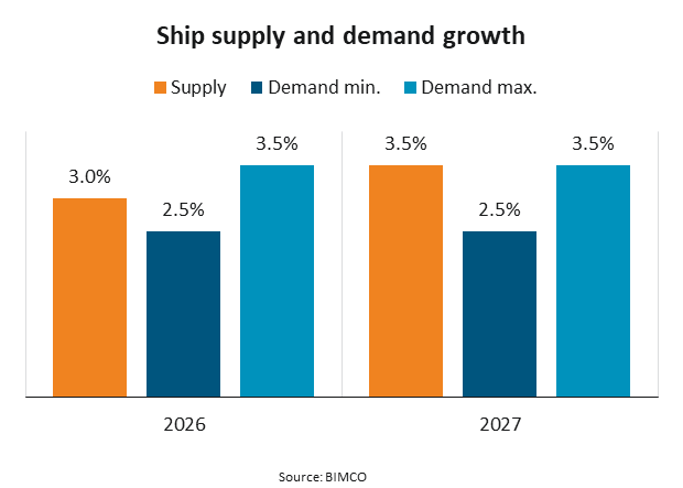Assuming higher recycling of older ships and reduced average sailing speeds, BIMCO forecasts that 2026 conditions will be similar to 2025, with slightly weaker conditions in 2027. Ship demand is expected to grow 2.5–3.5% annually, while supply may increase 3% in 2026 and 3.5% in 2027.