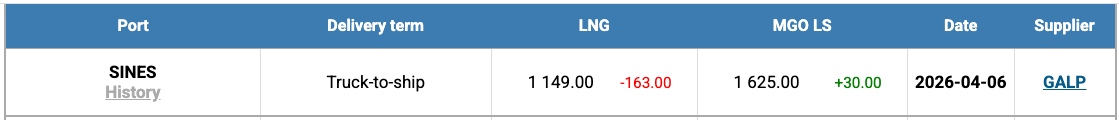 The price of LNG as a bunker fuel at the port of Sines (Portugal) declined by a further US$ 163.00 this week, falling to US$ 1,149/MT from US$ 1,312/MT the previous week. At the same time, the price differential between LNG and conventional fuel continued to widen significantly, reaching US$ 476 in favor of LNG (compared to US$ 195 a week earlier). As of April 6, MGO LS was quoted at US$ 1,625/MT at the port of Sines.
