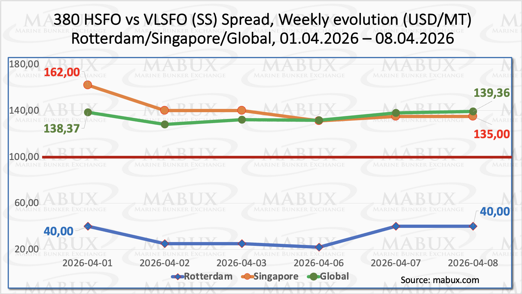 The MABUX Global Scrubber Spread (SS)—the price differential between 380 HSFO and VLSFO—edged up marginally by US$ 0.99, rising from US$ 138.37 last week to US$ 139.36, and remaining well above the psychological breakeven threshold of US$ 100.00. However, the weekly average of the index declined by US$ 9.95, indicating underlying weakening momentum. In Rotterdam, the SS Spread remained unchanged at US$ 40.00, although it briefly narrowed to US$ 22.00 during the period.