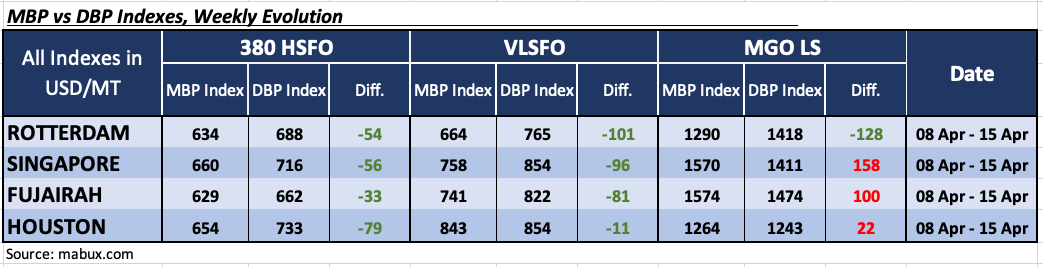 Amid the ongoing conflict in the Middle East, the MABUX Market Differential Index (MDI)—which reflects the ratio between market bunker prices (MBP) and the MABUX digital bunker benchmark (DBP)—demonstrated the following trends across the world’s largest hubs: Rotterdam, Singapore, Fujairah, and Houston: