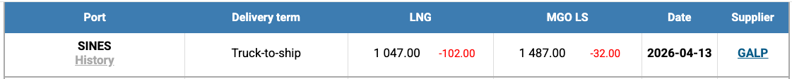 The price of LNG as a bunker fuel at the port of Sines (Portugal) continued its downward trend, declining by a further US$ 102.00 week-on-week to US$ 1,047/MT (from US$ 1,149/MT previously). As a result, the price differential between LNG and conventional marine fuel narrowed to US$ 440 in favor of LNG, compared to US$ 476 the week before. On April 13, MGO LS at the port of Sines was quoted at US$ 1,630/MT.