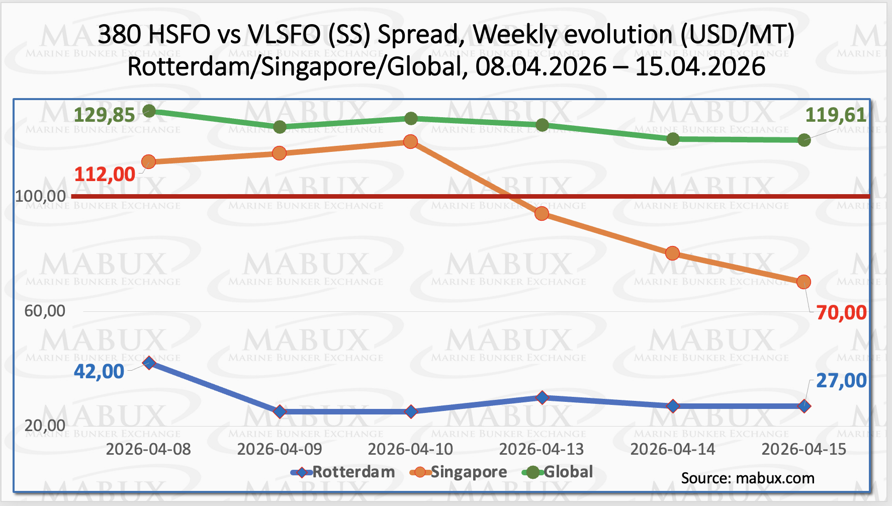 The MABUX Global Scrubber Spread (SS)—the price differential between 380 HSFO and VLSFO—entered a contraction phase, declining by US$ 10.24 from US$ 129.85 to US$ 119.61, thus falling below the US$ 120.00 mark. Despite this decrease, the spread remains comfortably above the psychological threshold of US$ 100.00 (SS breakeven). The weekly average of the index also edged down by US$ 10.22.
