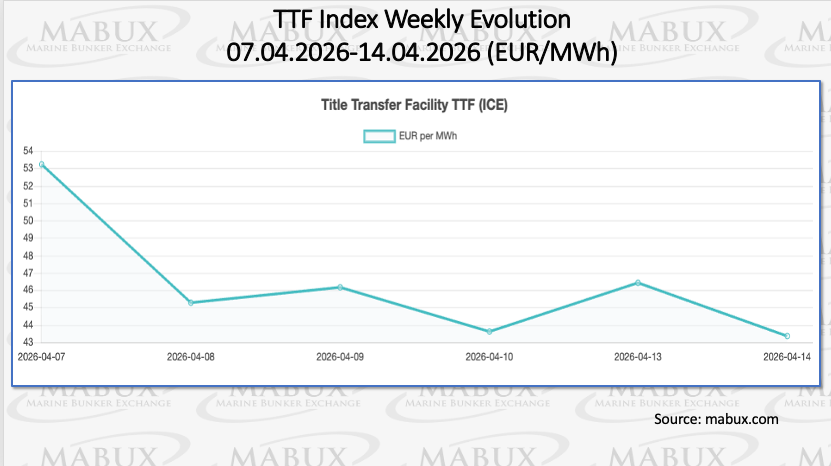 As of April 14, the level of natural gas in European underground storage facilities showed a slight increase, reaching 29.55% of total capacity, up by 0.94 percentage points compared to the previous week. However, current storage levels remain significantly lower—by 31.91%—than those recorded on January 1, 2026 (61.46%). At the end of Week 16, the European gas benchmark TTF recorded a notable decline, falling by EUR 9.882/MWh from EUR 53.247/MWh to EUR 43.365/MWh, thereby dropping below the EUR 50.00/MWh threshold.