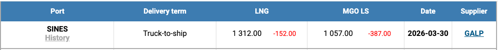 The price of LNG as a bunker fuel at the port of Sines (Portugal) declined sharply by US$ 152, falling to US$ 1,312/MTfrom US$ 1,464/MT the previous week. At the same time, the price differential between LNG and conventional fuel shifted in favor of LNG, widening to US$ 195, compared to a US$ 21 advantage for conventional fuel a week earlier. As of March 30, MGO LS was quoted at US$ 1,507/MT in the port of Sines.