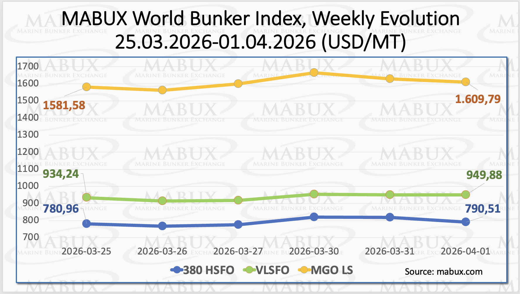 Over the past week, bunker indices have maintained an upward trajectory, with signs of stabilization near recently reached highs. According to Sergey Ivanov, Director, MABUX, “The market remains highly sensitive to geopolitical developments, with supply disruptions continuing to drive extreme price volatility.”