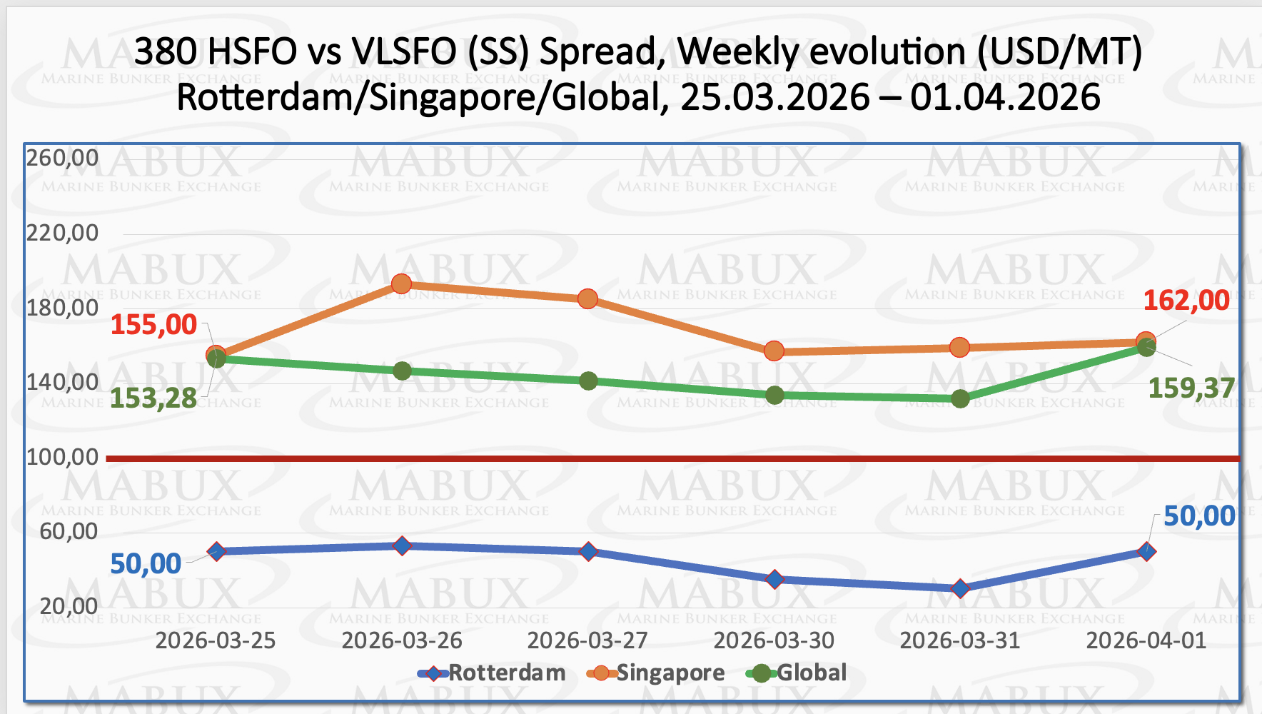 The MABUX Global Scrubber Spread (SS)—the price differential between 380 HSFO and VLSFO—widened by US$ 6.09, increasing from US$ 153.28 last week to US$ 159.37. The spread remains firmly above the psychological breakeven threshold of US$ 100.00. However, the weekly average of the index declined by US$ 5.27, indicating underlying instability despite the headline increase.