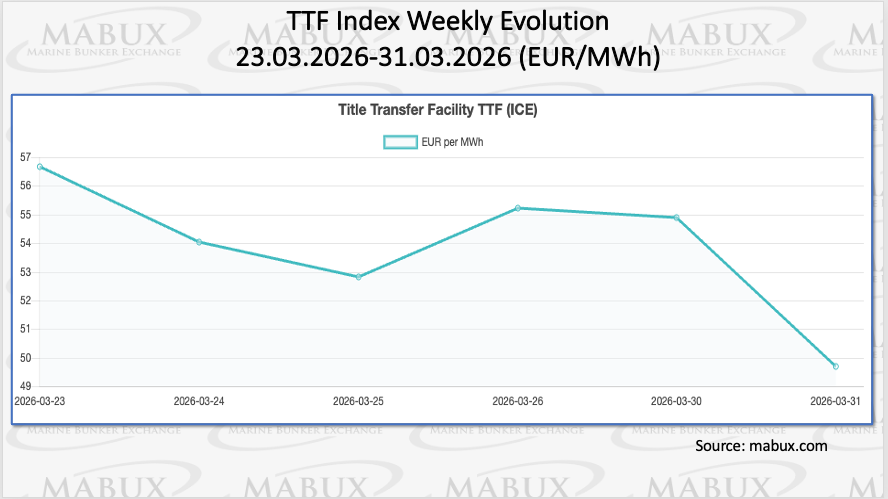 As of 31 March, European underground gas storage levels continued their downward trajectory, declining to 28.05% of total capacity, a decrease of 1.24 percentage points week-on-week. Storage levels are now 33.41 percentage pointsbelow those recorded on 1 January 2026 (61.46%). A relatively severe winter across continental Europe contributed to stronger-than-anticipated heating demand, accelerating the depletion of inventories. At the same time, the European TTF gas benchmark declined by EUR 6.98/MWh to EUR 49.70/MWh, compared to EUR 56.68/MWh the previous week, remaining close to the EUR 50.00/MWh level.