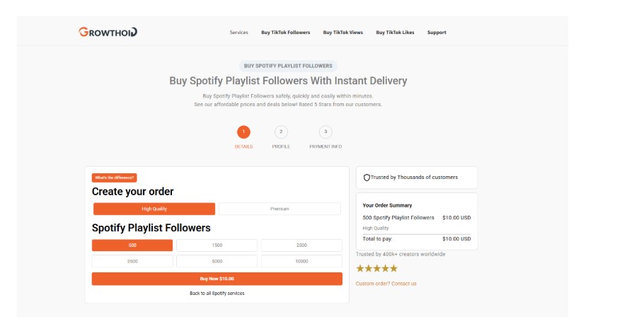To complete the process, you should select the package you want, enter your Spotify profile link, and your order starts shortly after. No password is needed, so your account remains secure.