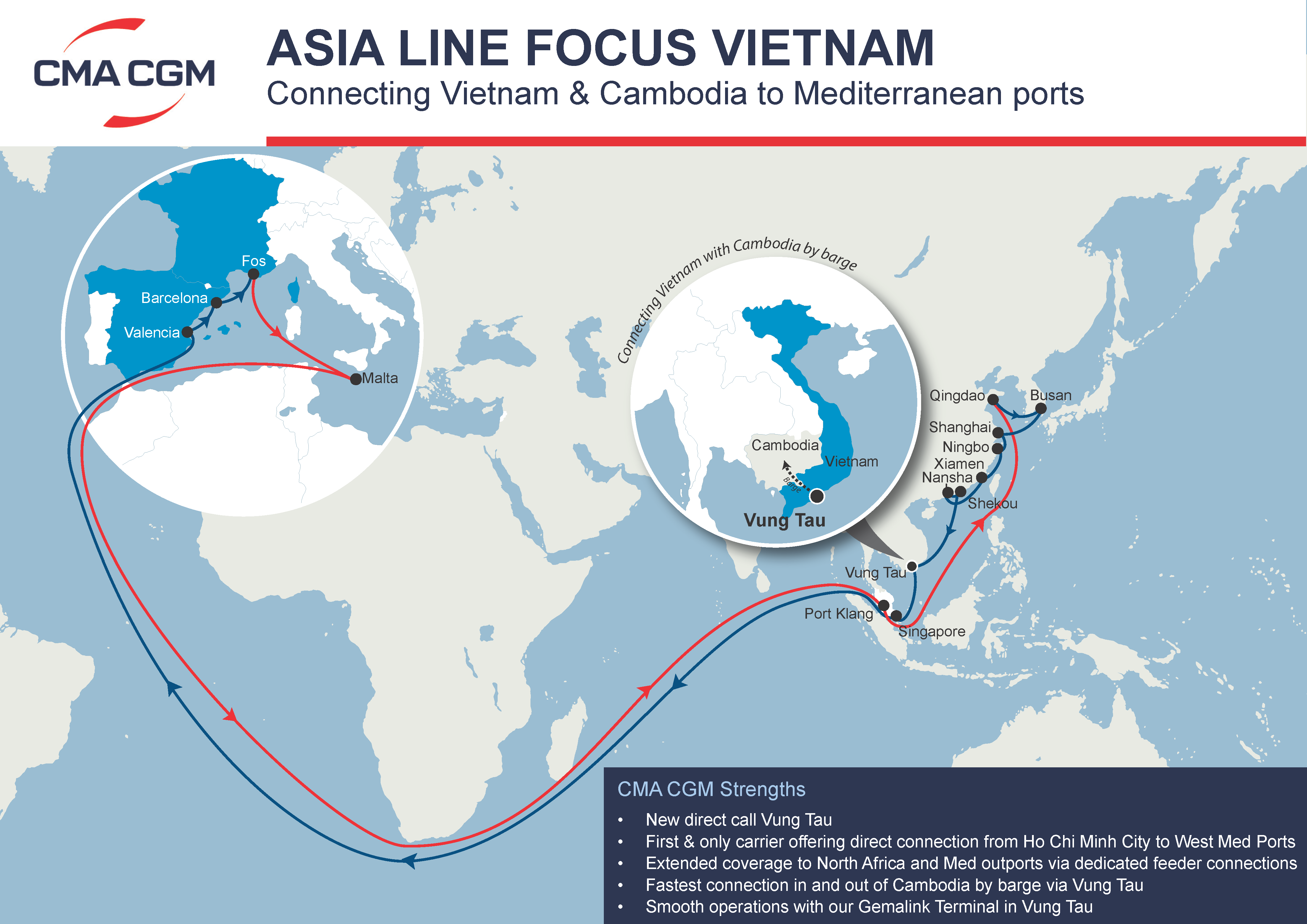 With this new direct link, CMA CGM becomes the only carrier offering a direct service from Vung Tau to the Mediterranean, reinforcing its market leadership in the region. The combination of Phnom Penh–Vung Tau barge connectivity and MEX core loop vessels—alongside strategic Mediterranean hubs in Valencia, Fos-sur-Mer, and Malta—enables the group to deliver faster, more reliable service options for customers.