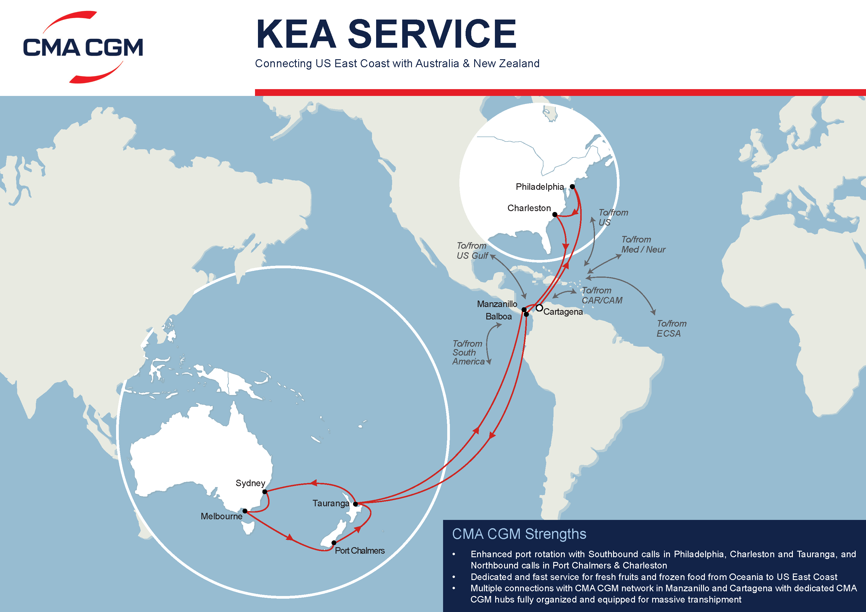 CMA CGM will launch a new KEA service connecting the US East Coast with Oceania, offering faster, more reliable coverage for the trade route. The service complements the existing RTW PAD product, giving the carrier two weekly departures on this corridor.