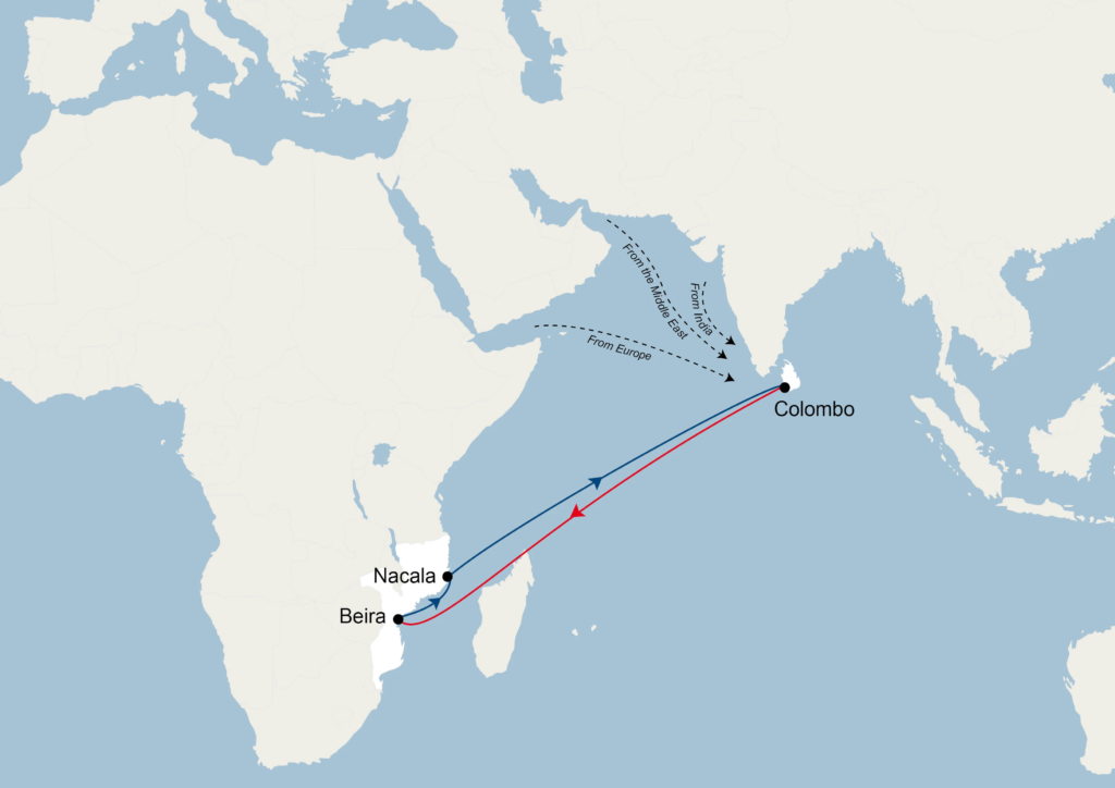 Route: Connects all origins to Mozambique via the Colombo hub.