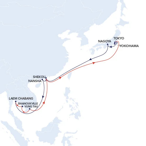 Tokyo – Yokohama – Nagoya – Shekou – Nansha – Laem Chabang – Sihanoukville – Vung Tau – Shekou – Tokyo
