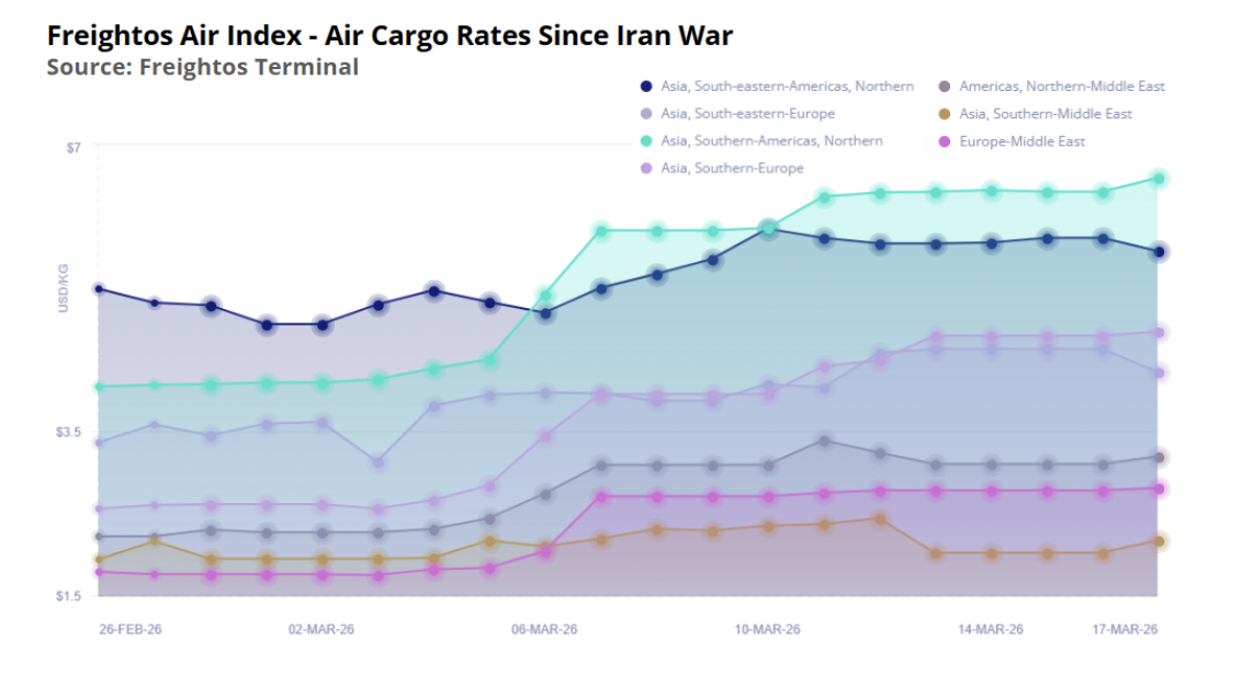 With the drop in available capacity out of these Gulf hubs and the increase in Asia volumes looking for alternate routes to Europe, Freightos Air Index rates have spiked on many of these lanes. South Asia – Europe prices climbed to $4.72/kg as of today, 84% higher than just before the war began, with South East Asia – Europe rates up 26% to $4.23/kg and Europe – Middle East prices up 57% to $2.82/kg, with some of these increases likely partially due to fuel surcharges being rolled out by some carriers.
