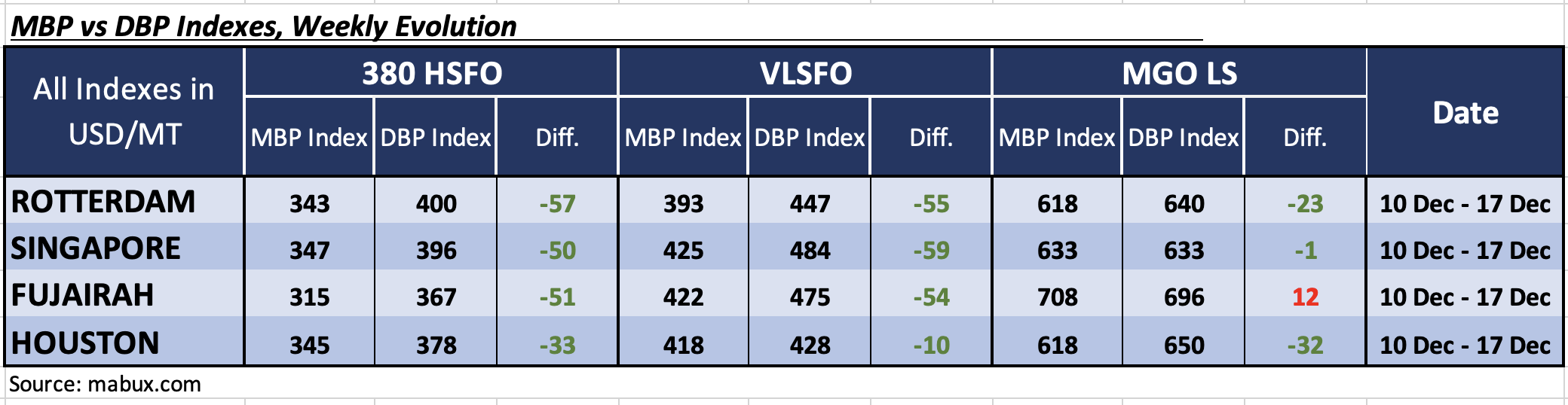 By the end of Week 51, the MABUX Market Differential Index (MDI)—reflecting the ratio of market bunker prices (MBP) to the MABUX Digital Bunker Benchmark (DBP)—showed the following trends across the world’s largest hubs: Rotterdam, Singapore, Fujairah, and Houston: