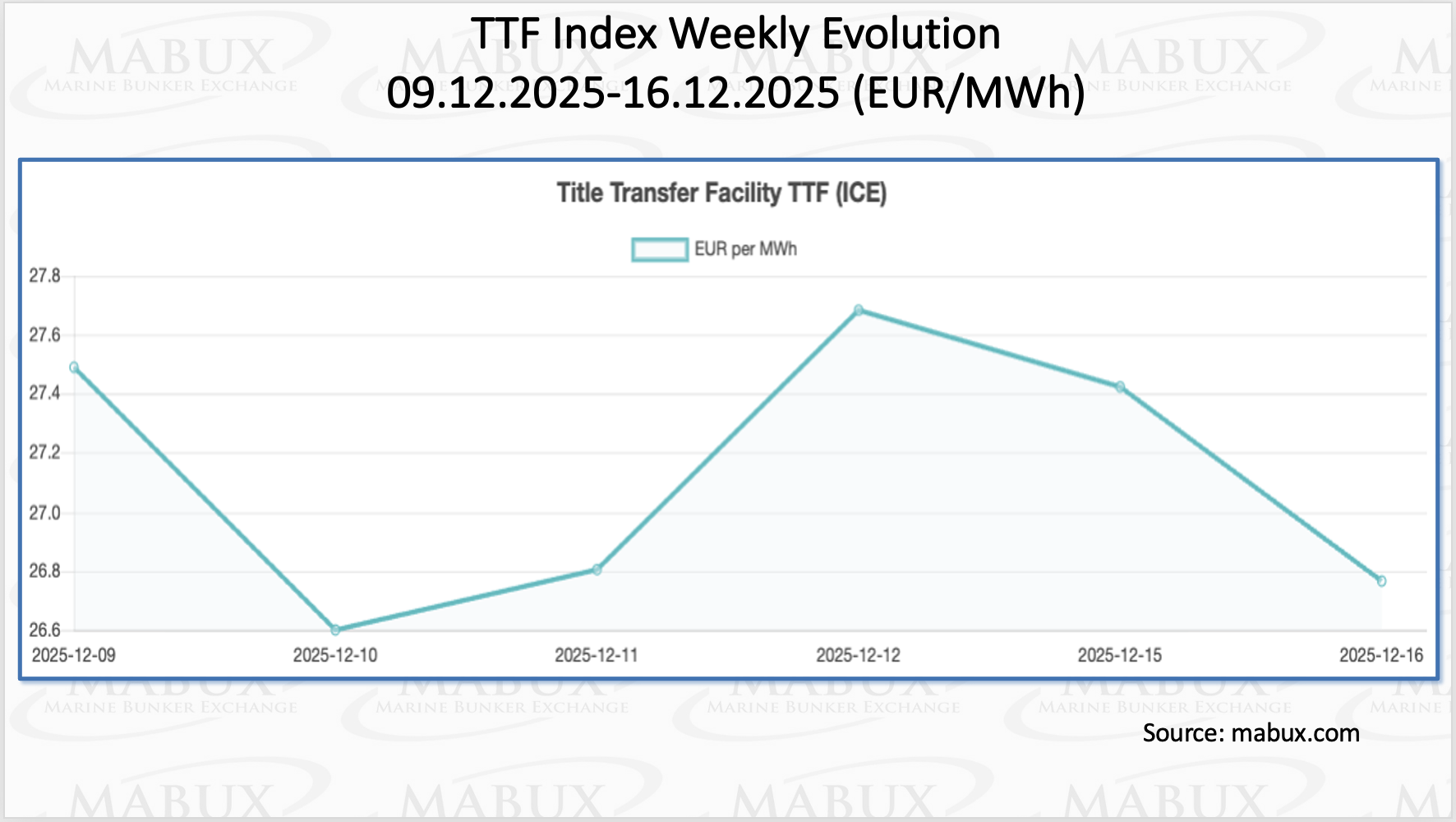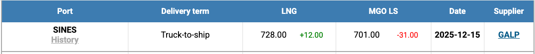 The price of LNG as a bunker fuel at the port of Sines (Portugal) increased by a further USD 12.00/MT this week to US$728/MT, up from US$716/MT last week. As a result, the price spread between LNG and conventional fuel shifted in favor of conventional fuel—for the first time since October 20, 2025—with the differential widening to US$27/MT, compared with US$16/MT in favor of LNG the previous week. As of December 15, MGO LS at the port of Sines was assessed at US$701/MT.