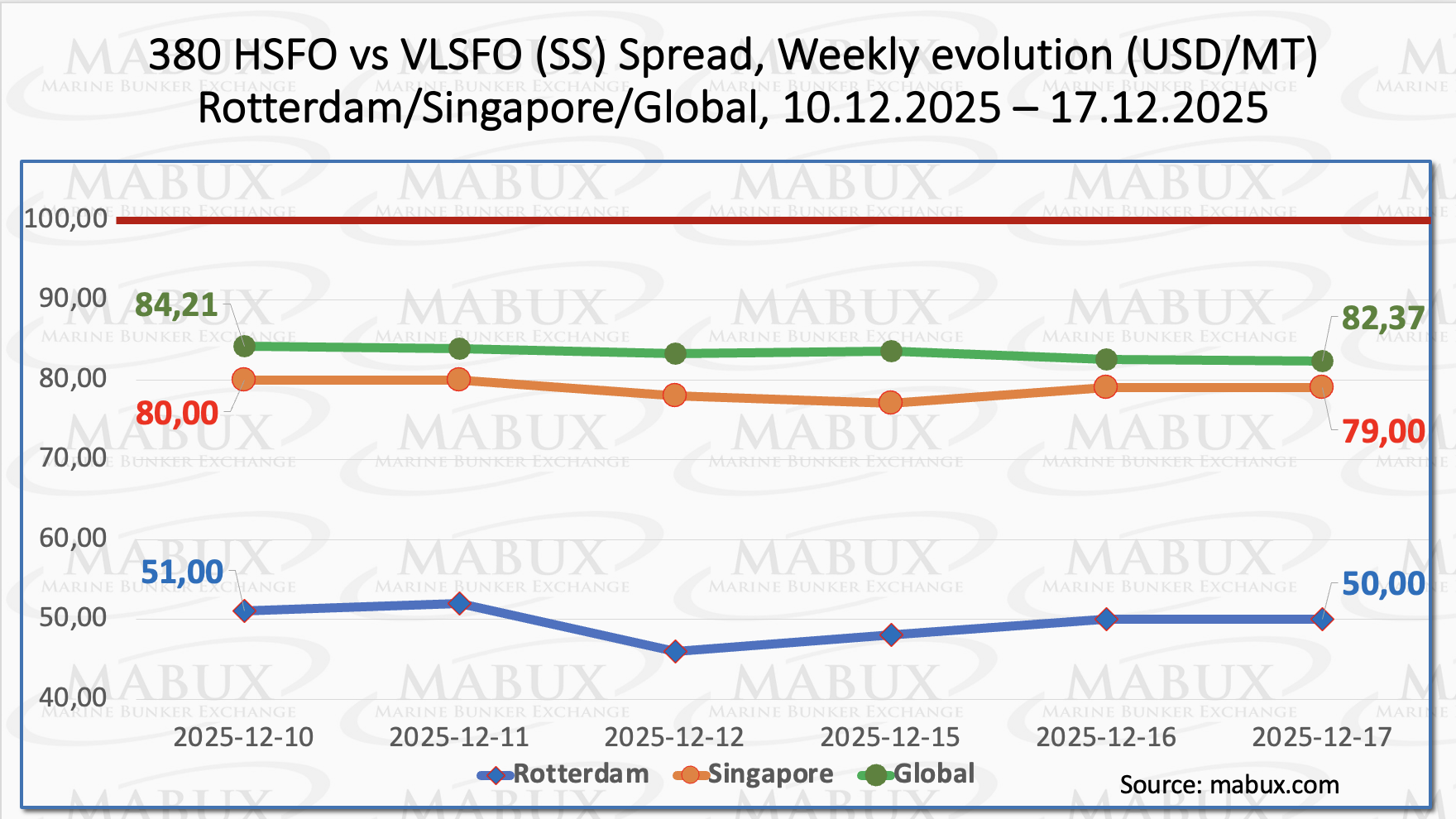 In Singapore, the 380 HSFO/VLSFO spread also decreased by US$1.00, to US$79.00, slipping below the US$80.00 mark; the weekly average in the port fell by US$4.17. Overall, SS Spread indicators continue to move in mixed directions without forming a clear trend.