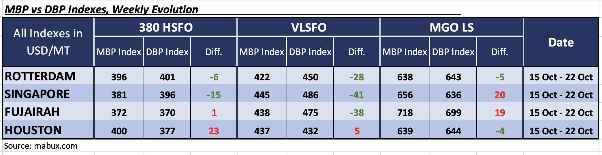 At the end of Week 43, the MABUX Market Differential Index (MDI) — which reflects the ratio between market bunker prices (MBP) and the MABUX digital bunker benchmark (DBP) — indicated the following bunker fuel price dynamics across the world’s major hubs: Rotterdam, Singapore, Fujairah, and Houston: