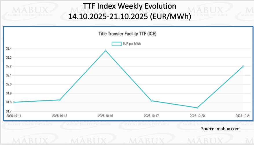 As of October 21, European regional gas storage facilities were 82.83% full, marking a decline of 0.26% from the previous week — the first negative movement since April this year. Current storage levels remain 11.50% higher than at the start of the year (71.33%). With the onset of lower temperatures, the rate of gas withdrawal has slightly exceeded the rate of injection, indicating the beginning of the seasonal drawdown phase. By the end of Week 43, the European gas benchmark TTF reversed its previous downward trend, rising by 0.399 euros/MWh to 32.200 euros/MWh from 31.801 euros/MWh a week earlier.