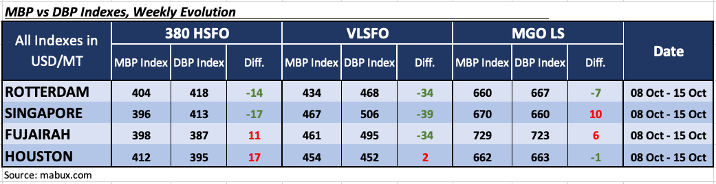 At the end of the 42nd week, the MABUX Market Differential Index (MDI)—the ratio of market bunker prices (MBP) to the MABUX digital bunker benchmark (DBP)—reflected the following price dynamics across the world’s largest hubs: Rotterdam, Singapore, Fujairah, and Houston: