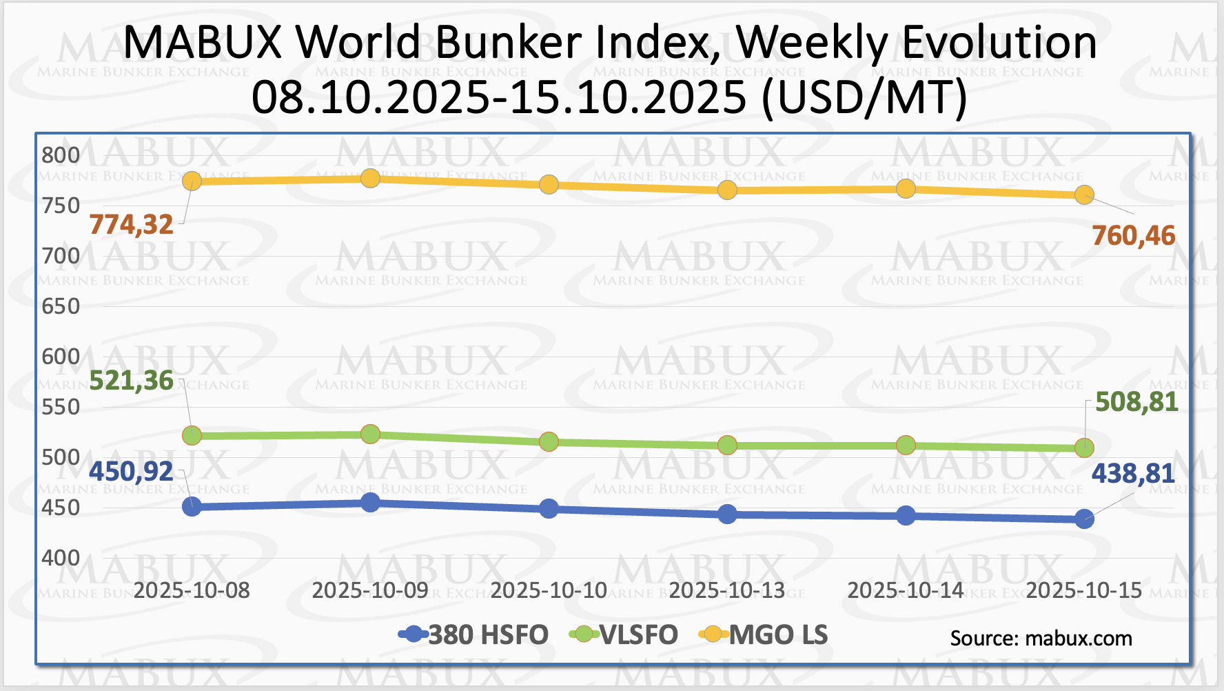 At the end of the 42nd week, global bunker indices MABUX continued their downward trajectory, defying expectations of an upward correction. The 380 HSFO index declined by US$12.11, to US$438.81/MT, slipping below the US$450 threshold.