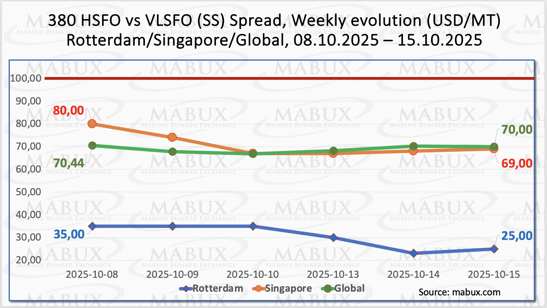 The weekly average in the port fell by US$10.00. In Singapore, the 380 HSFO/VLSFO price spread narrowed by US$11.00, from US$80.00 to US$69.00, while the weekly average slipped by US$1.50.