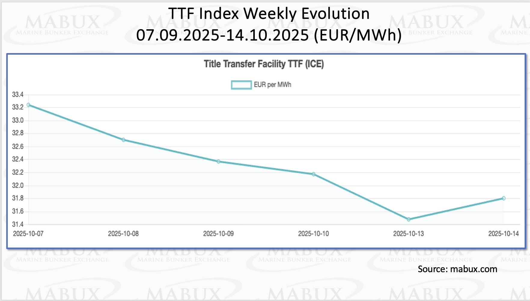 As of October 14, European regional gas storage facilities were 83.09% full, reflecting a 0.54% increase compared to the previous week. This level is 11.76% higher than at the beginning of the year (71.33%), although the pace of injections remains relatively modest. By the end of the 42nd week, the European TTF gas benchmark continued its downward trend, declining by €1.445/MWh to €31.801/MWh, compared to €33.246/MWh a week earlier.