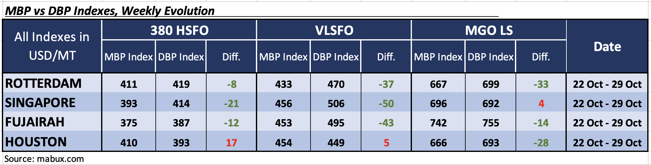 At the end of Week 44, the MABUX Market Differential Index (MDI) — representing the ratio of Market Bunker Prices (MBP) to the MABUX Digital Bunker Benchmark (DBP) — reflected the following price trends across the world’s major bunkering hubs: Rotterdam, Singapore, Fujairah, and Houston: