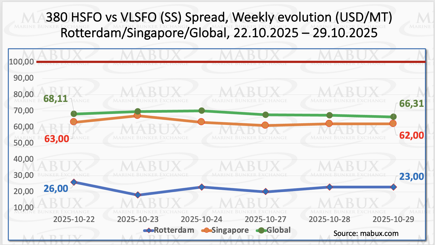 The MABUX Global Scrubber Spread (SS) — the price difference between 380 HSFO and VLSFO — continued to narrow, declining by US$1.80 (from US$68.11 last week to US$66.31), and remained consistently below the psychological threshold of US$100.00 (SS breakeven level).
