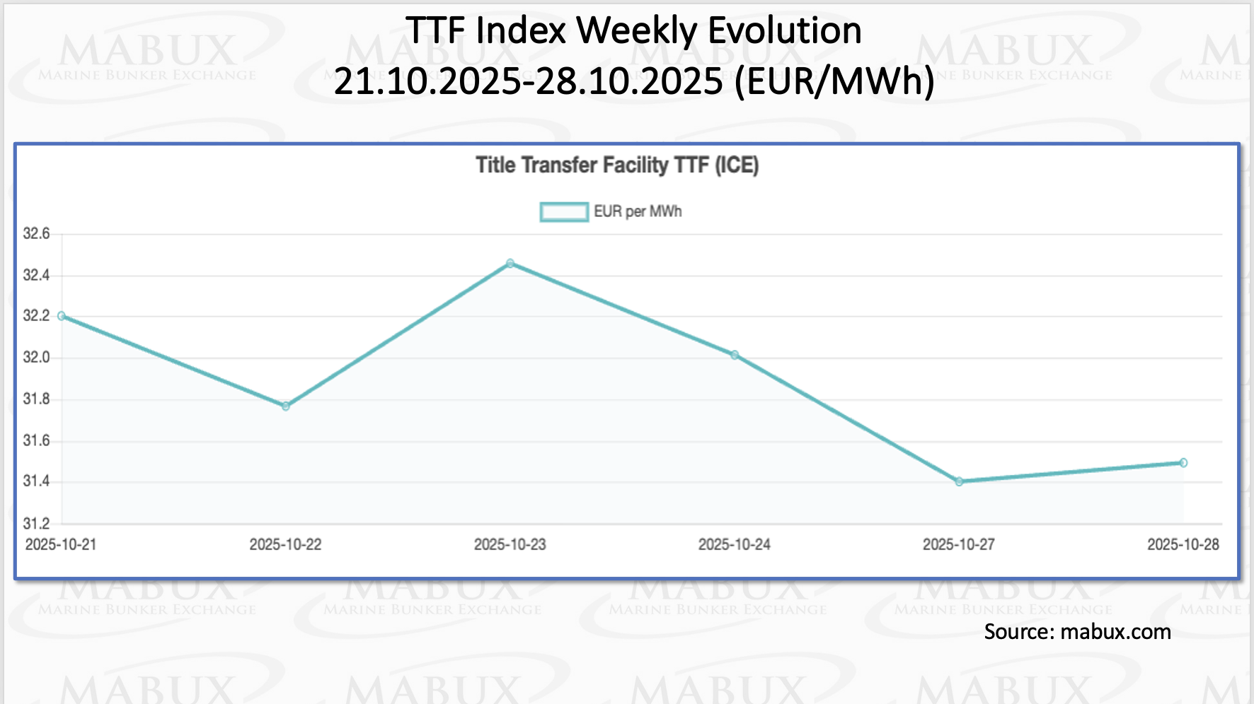At the close of Week 44, the European TTF gas benchmark declined moderately by €0.706/MWh, down to €31.494/MWh from €32.200/MWh a week earlier.