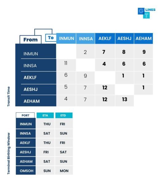 GT Lines said the service is designed to deliver some of the fastest lead times in the India–Gulf trade. Transit time from West India to the Northern Emirates will be around six days, while return voyages are expected to take four days.