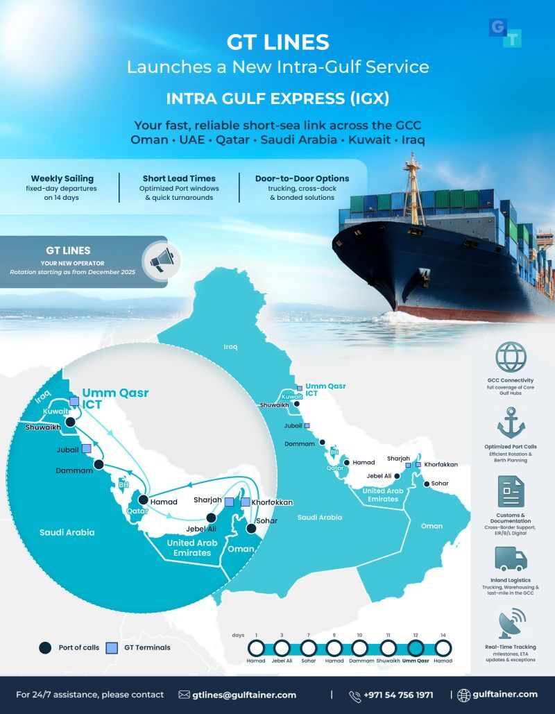 Gulftainer is launching GT Lines’ Intra-Gulf Express (IGX) in December, offering a fast, reliable short-sea shipping link across the GCC and Iraq.