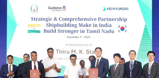 HD Hyundai has entered a major strategic partnership with the Tamil Nadu state government to establish a new shipyard in southern India. The agreement was formalized during a ceremony held in Madurai with the participation of Tamil Nadu Chief Minister M.K. Stalin, State Industries Minister T.R.B. Rajaa, and Choi Hannae, Head of Corporate Planning at … Continue reading HD Hyundai signs MOU with Tamil Nadu to develop new Indian shipyard