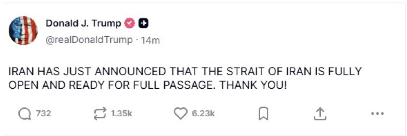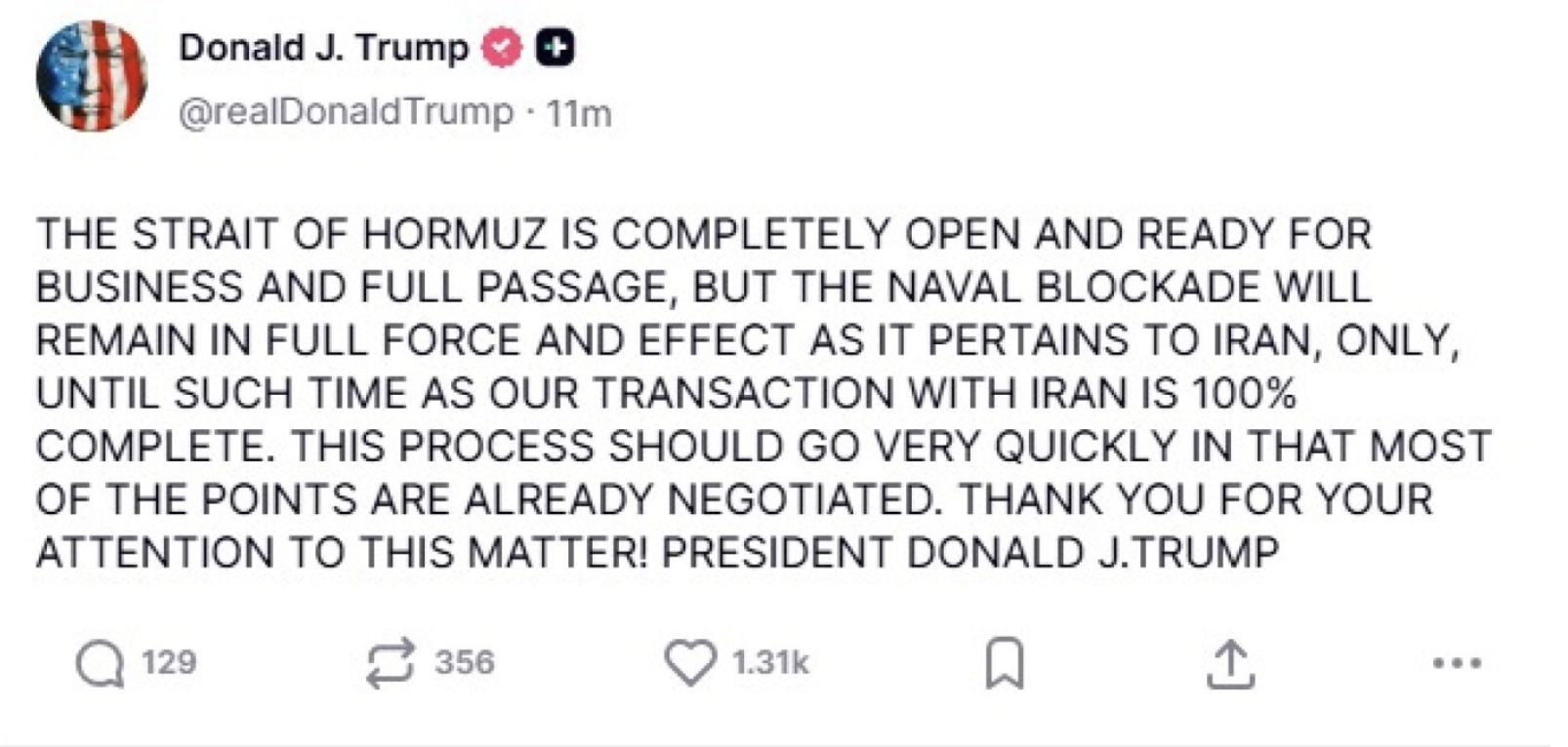 “Iran has just announced that its straits are fully open and ready for uninterrupted transit. Thank you,” said Donald Trump, President of the United States.