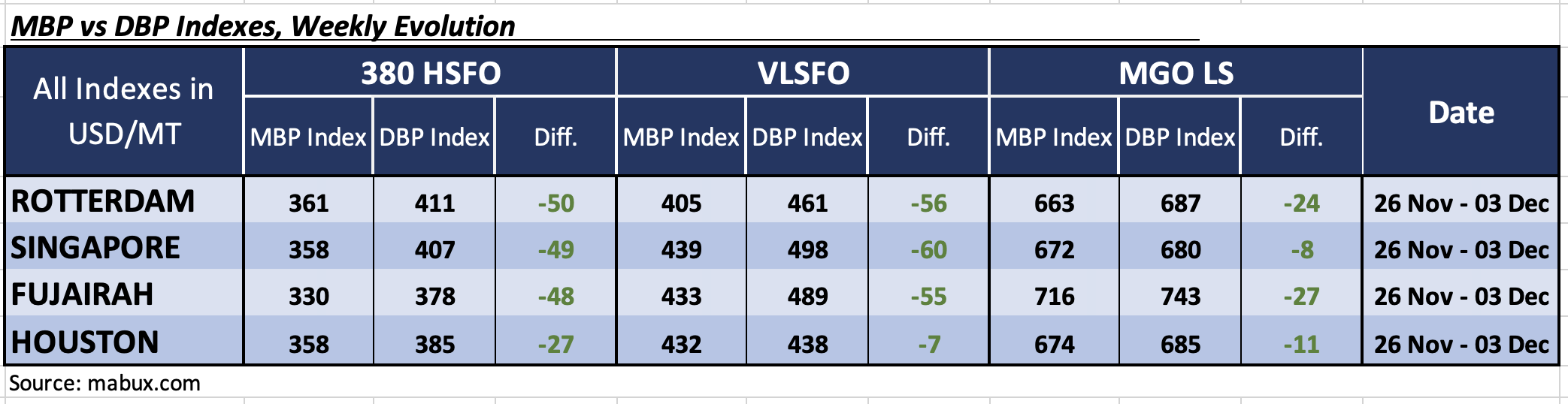 By the end of Week 49, the MABUX Market Differential Index (MDI)—reflecting the ratio of market bunker prices (MBP) to the MABUX Digital Bunker Benchmark (DBP)—continued to indicate a prevailing underpricing trend across all major fuel grades in the world’s key hubs: Rotterdam, Singapore, Fujairah, and Houston: