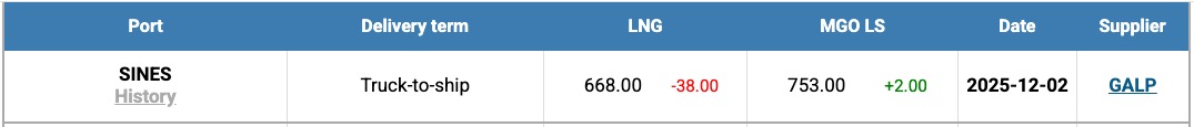 The price of LNG as bunker fuel at the port of Sines (Portugal) fell by a further US$36.00 this week, to US$668/MT from US$706/MT the previous week. The price differential between LNG and conventional fuel remained in LNG’s favor, narrowing to US$85 from US$122 a week earlier: MGO LS was quoted at US$753/MT in Sines on the same day.