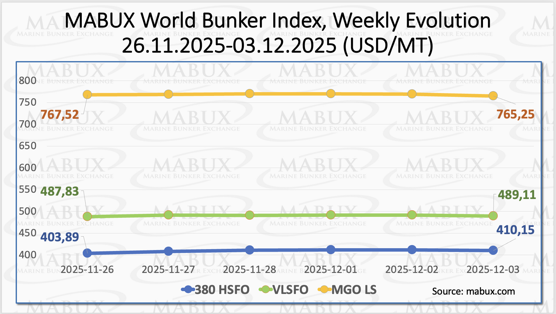 At the close of Week 49, the global MABUX bunker indices moved in mixed directions, with no distinct trend emerging. The 380 HSFO index rose by US$6.26 to US$410.15/MT. The VLSFO index edged up by US$1.28 to US$489.11/MT, while still remaining below the US$500/MT threshold. In contrast, the MGO LS index declined by US$2.27 to US$765.25/MT. At the time of writing, global bunker fuel prices continued to show no clear directional momentum.