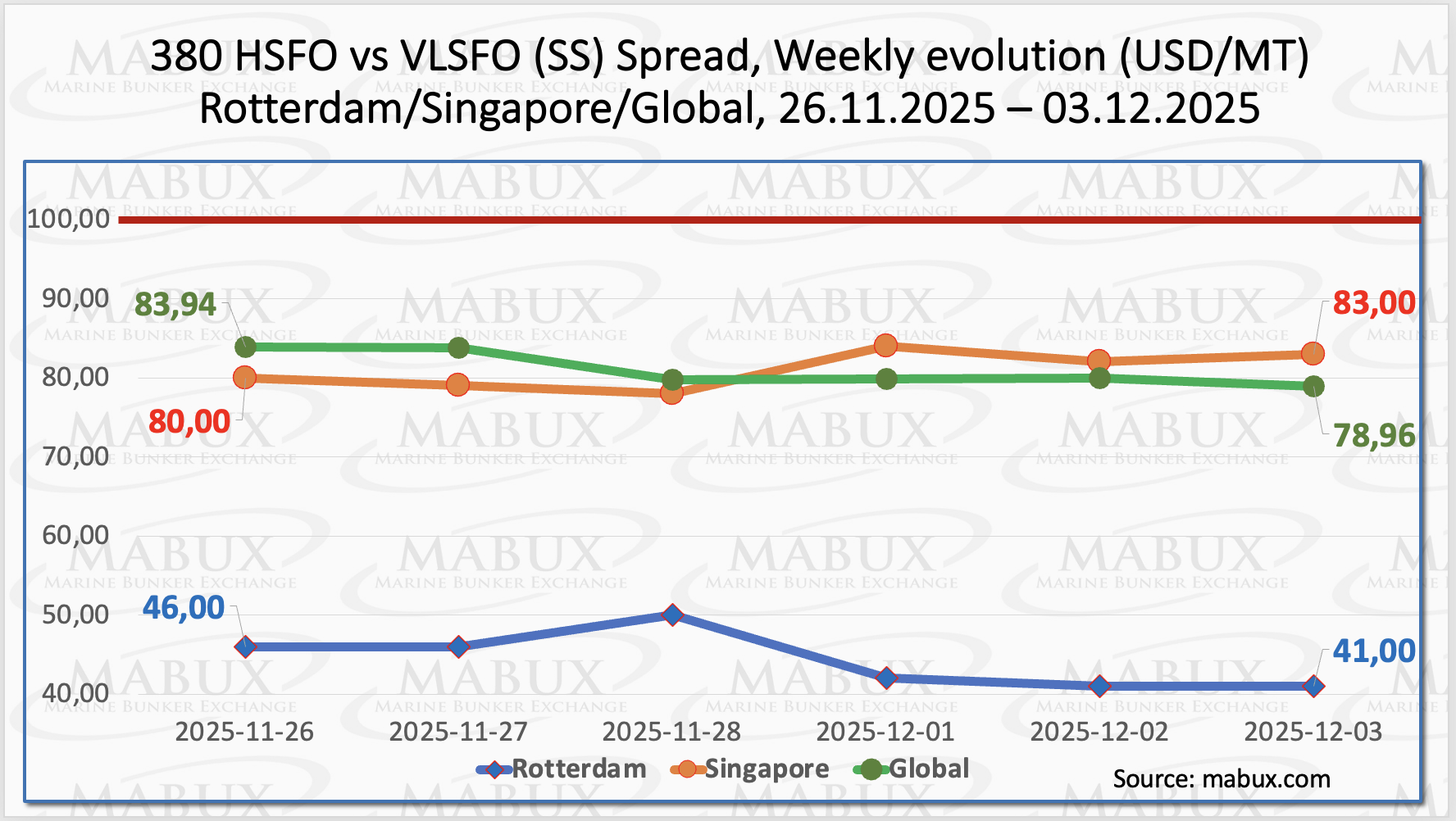 In Rotterdam, the SS spread narrowed by US$5.00 to US$41.00, compared to US$46.00 last week. The port’s weekly average SS value also decreased by US$3.67. In Singapore, by contrast, the 380 HSFO/VLSFO spread widened by US$3.00, from US$80.00 last week to US$83.00. However, the weekly average SS value in the port declined by US$6.00.