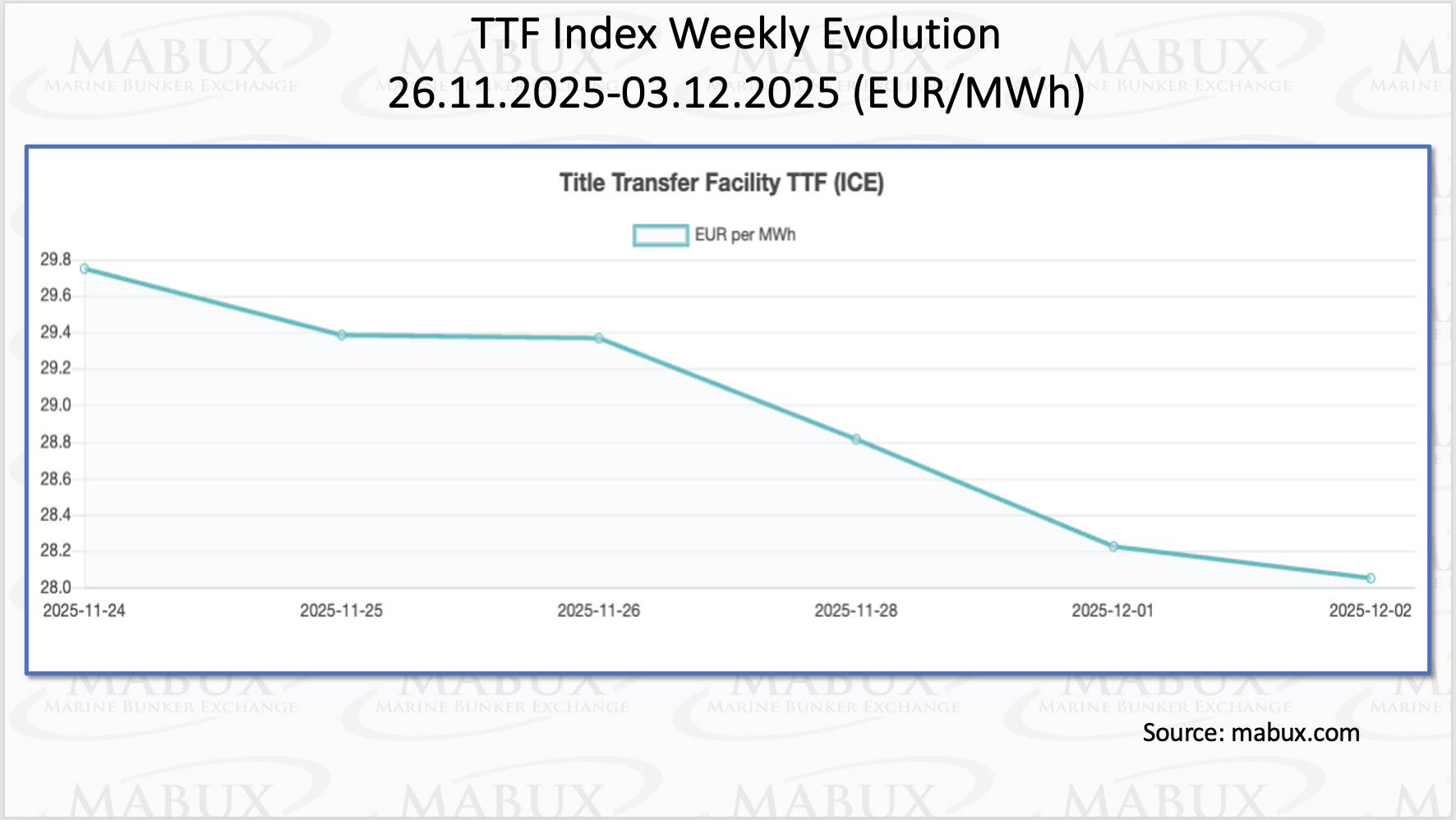 As of Dec. 02, European regional gas storage sites were filled to 74.95% (down 2.64% from the previous week), while gas withdrawal rates increased sharply over the week. Current storage levels are close to the early-2025 benchmark of 71.33% and exceed it by only 3.62%. Although European gas reserves continue to decline and remain below last year’s level for the same period, increasing LNG inflows are helping to ease concerns over a potential supply shortfall. By the end of Week 49, the European gas benchmark TTF extended its moderate decline, falling by 1.897 euros/MWh to 28.050 euros/MWh, compared with 29.747 euros/MWh last week.