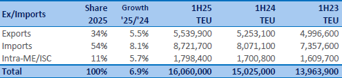 Exports also achieved reasonable 5-6% growth, though this represented the weakest performance of the three categories. With this also being the weaker of the intercontinental legs, the imbalance grew by 364,000 TEU to approach 3.2 million TEU.