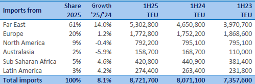 Elsewhere, imports from Australasia declined by 5.9% although sub-Saharan Africa lost more containers at 20,000 TEU.