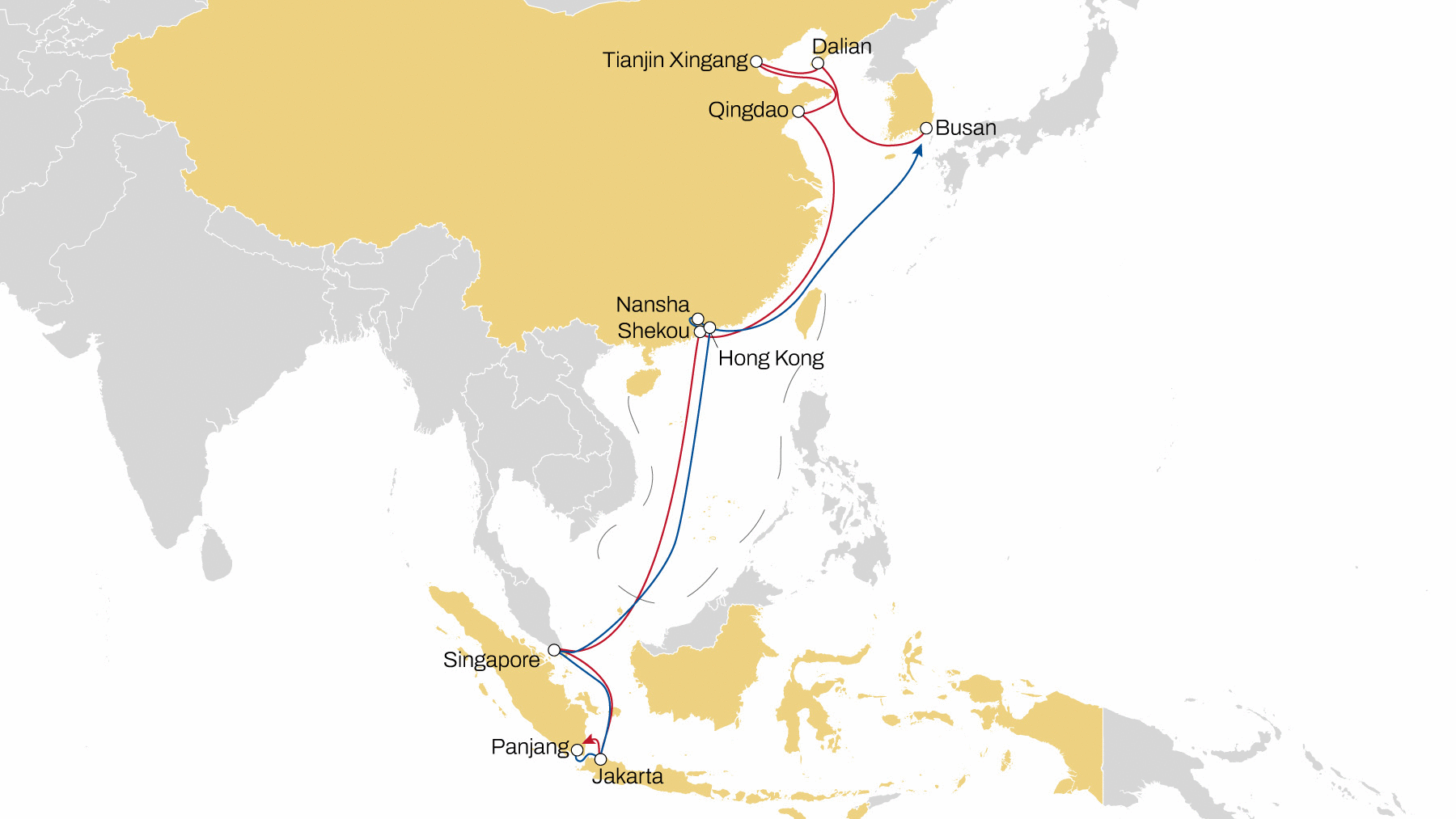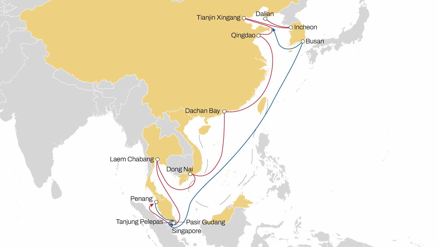 Sambar rotation: Dalian – Incheon – Tianjin Xingang – Qingdao – Da Chan Bay – Dong Nai – Laem Chabang – Singapore – Penang – Pasir Gudang – Singapore – Tanjung Pelepas – Busan – Dalian.