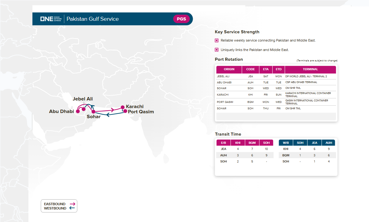 Ocean Network Express (ONE) has announced the launch of its new Pakistan Gulf Service (PGS), designed to strengthen trade links and improve connectivity between Pakistan and the Middle East.