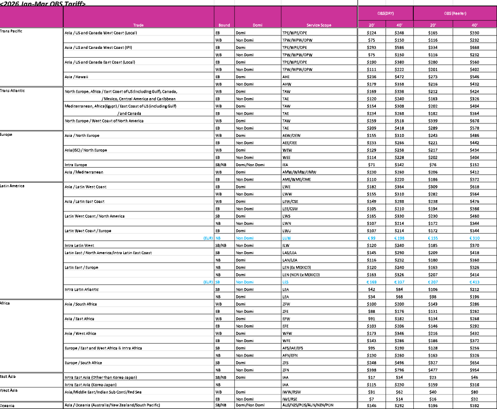 The OBS tariff chart covering the period 1 January to 31 March 2026 has been provided to customers. ONE encouraged shippers with questions or account-specific needs to contact their local representative.