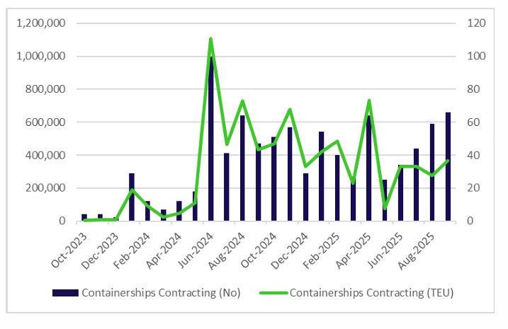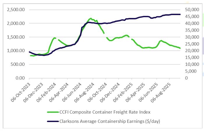 The outlook for the sector remained uncertain, shaped by persistent overcapacity and the re-imposition of US tariffs, which further constrained demand for maritime transport. These pressures resulted in an unbroken downward course, which by the end of the month had extended to eleven consecutive weeks of falling freight rates.