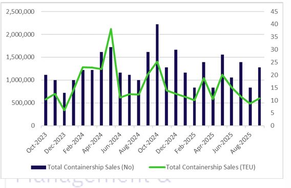 During September, the containership market remained on a downward trajectory, as freight rates continued to decline for several consecutive weeks. The initial signs of stabilization observed at the beginning of the month were not sustained, with the market quickly returning to a state of pressure.