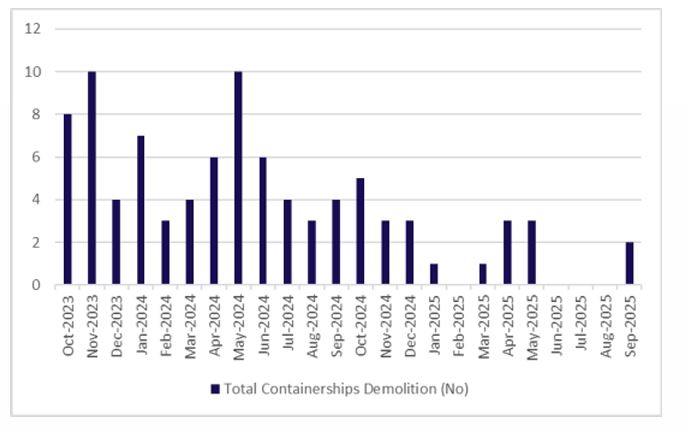 In August 2025, containership scrapping was a “bright exception” to the general market climate. From the beginning of the year to the end of July, only five ships of the category were sent for recycling, a significantly lower number compared to the thirty-three containerships that were scrapped in the corresponding period of the previous year and the forty-five the year before.