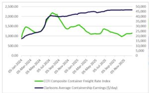Towards the end of October, the containership market experienced a slight recovery, although overall conditions continued to reflect a fragile balance, as the effects of increased capacity have not yet been absorbed.